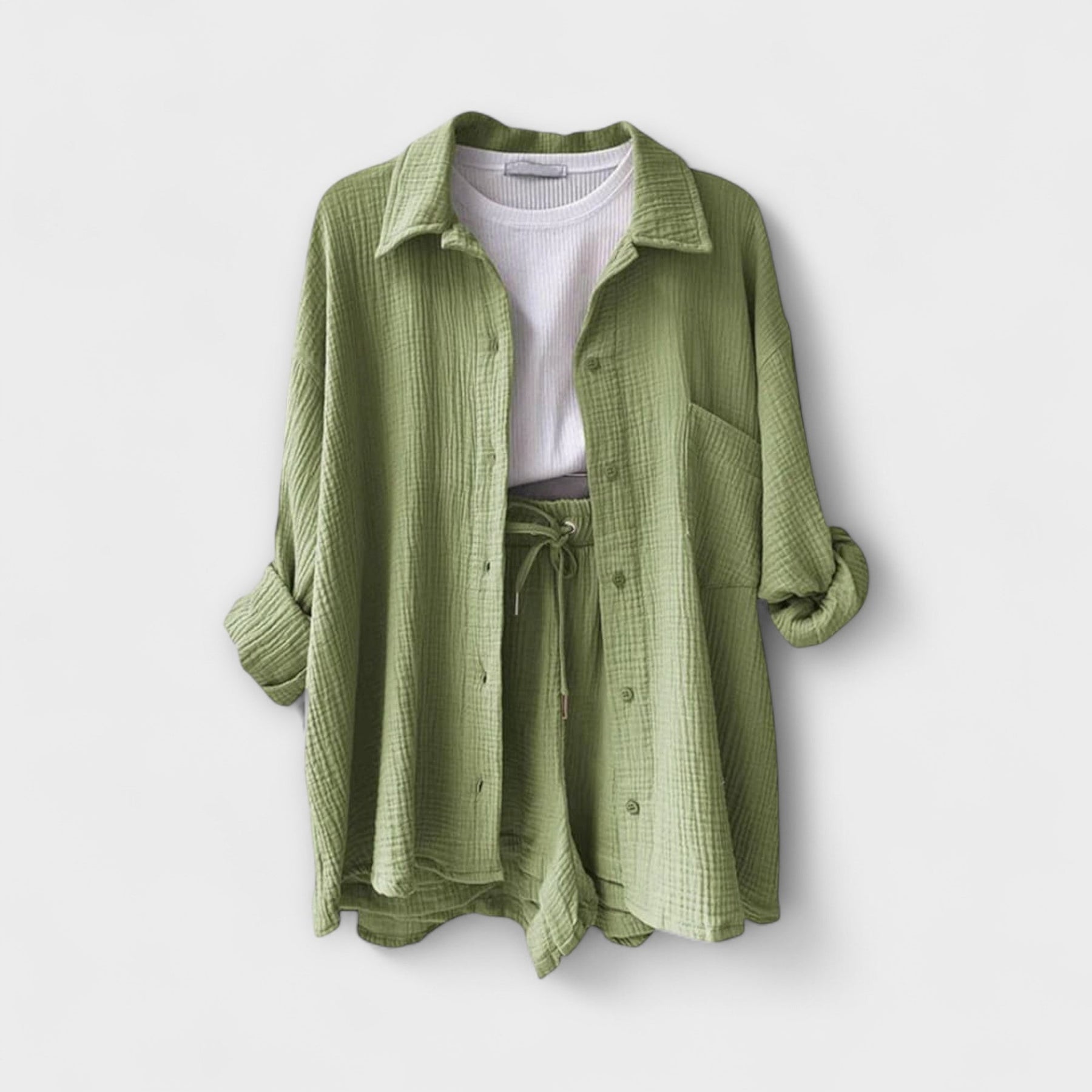 Victoria | Pohodlný 2-dielny set je dokonalá kombinácia pohodlia a štýlu pre tvoj šatník. Ideálny na teplé počasie, tento set je vyrobený z priedušných látok a má univerzálny, elegantný dizajn. Nezáleží na tom, či sa uvoľňuješ pri bazéne alebo sa vydávaš na neformálny výlet, tento set ponúka lichotivý strih, ktorý ťa celý deň udrží chladnou a sebavedomou.